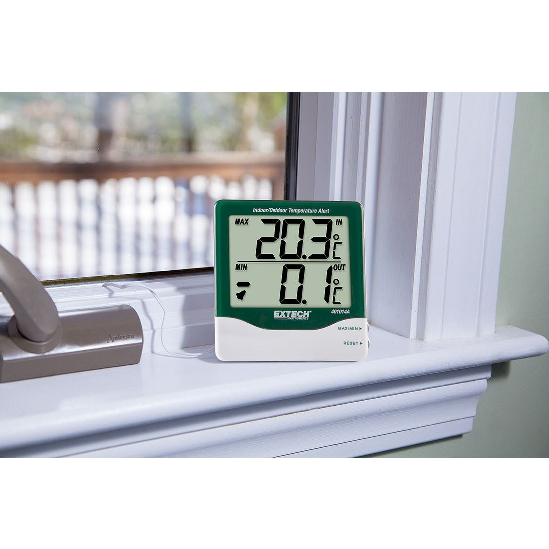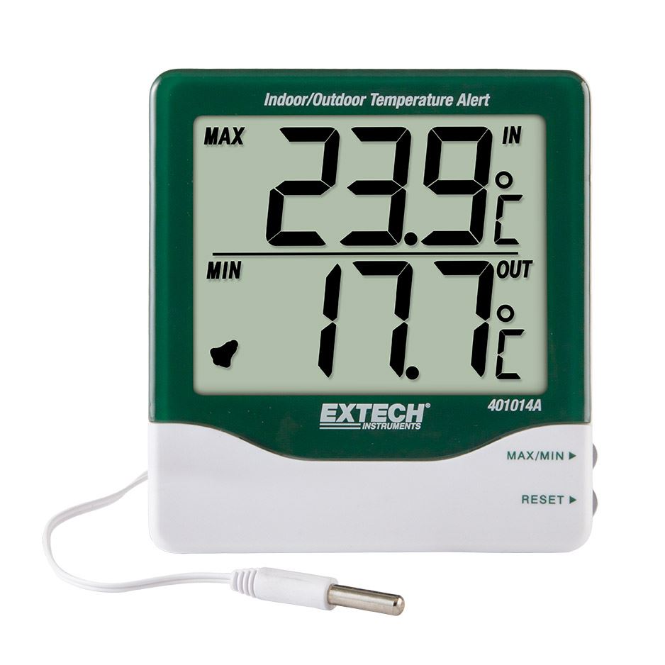 Extech 401014A met groot LCD heeft temperatuurbereik voor binnen (ingebouwde sensor): -10 tot 60°C (14 tot 140°F) en buiten (externe sonde): -58 tot 158°F (-50 tot 70°C), 0,1°F/°C resolutie en basisnauwkeurigheid van ±1,8°F (±1°C). Verdere kenmerken zijn programmeerbare High/Low hoorbare alarmen voor buitentemperatuur, interne geheugenopslag Min/Max-metingen, waterbestendige sensor met 3 meter (9,6 ft) dunne kabel voor afstandstemperatuurmetingen. De thermometer bevat een ingebouwde standaard voor gebruik op een bureau en een montagebeugel voor wandbevestiging.