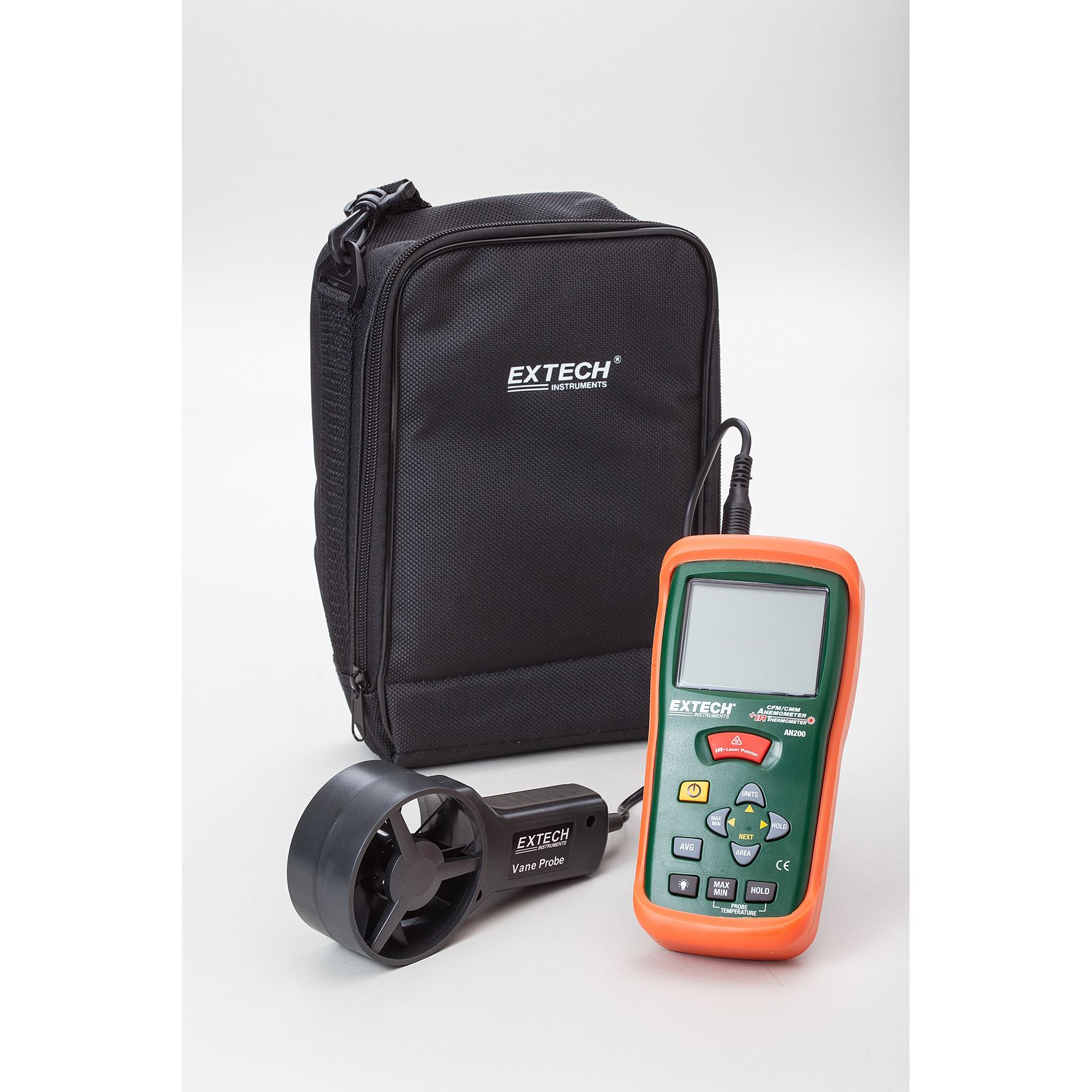 Extech AN200 is een CFM/CMM Mini Thermo-Anemometer met ingebouwde infraroodthermometer. De ingebouwde contactloze IR-thermometer meet de oppervlaktetemperaturen op afstand tot 260°C (500°F) met een afstands-spotverhouding van 8:1 en een laserpointer. De Extech CFM/CMM thermo-anemometer kan tegelijkertijd luchtstroom of luchtsnelheid en omgevingstemperatuur weergeven. 8 afmetingen (ft² of m²) instelbaar en kan worden opgeslagen in het interne geheugen van de meter. Andere kenmerken zijn dat het gemiddelde van maximaal 20 metingen kan worden berekend voor luchtstroom, groot verlicht LCD-scherm, Data Hold/MIN/MAX