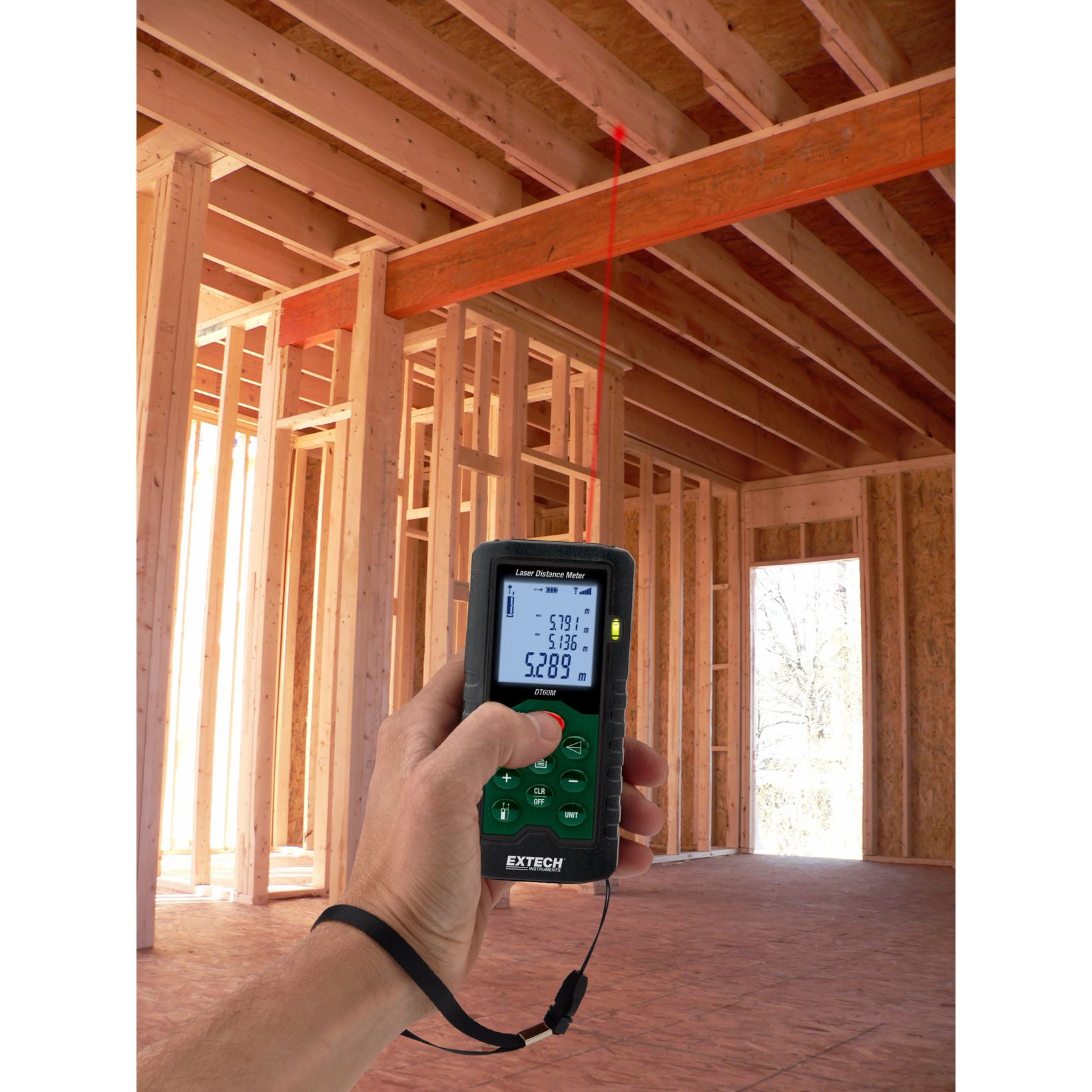 Extech DT60M meet een afstand tot 60 meter. Het kan oppervlakte en volume berekenen en met de geïntegreerde stelling van Pythagoras stelt het de gebruiker in staat om indirecte metingen te doen. Andere functies zijn onder meer continue meting met Min/Max-functie, automatisch opslaan tot 20 metingen, toevoegen/aftrekken van sequentiële metingen, voor-of achterrandreferentie, en een Stakeout-functie. Groot achtergrondverlicht LCD-scherm en dubbel gevormde behuizing. Extech DT60M beschikt ook over een geïntegreerd waterpas.