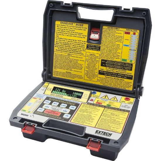 De Extech MG500 is een digitale hoogspanning isolatietester die spanning tot 10 kV meet en isolatieweerstand meet tot 500GΩ. Testspanningen zijn instelbaar van 500V tot 10kV DC in stappen van 500V. Verdere kenmerken zijn indicatie voor Polarisatie-index (PI) en Diëlektrische Absorptieverhouding (DAR) metingen: Deze tests worden gebruikt om de conditie van de isolatie in elektrische motoren, transformatoren en kabels te bepalen. De Extech MG500 heeft een CAT III 300 volt veiligheidsclassificatie, Live Circuit Warning (waarschuwing bij spanning >500V) en EnerSave™(beperkt testduur tot 10 seconden voor batterijbesparing).