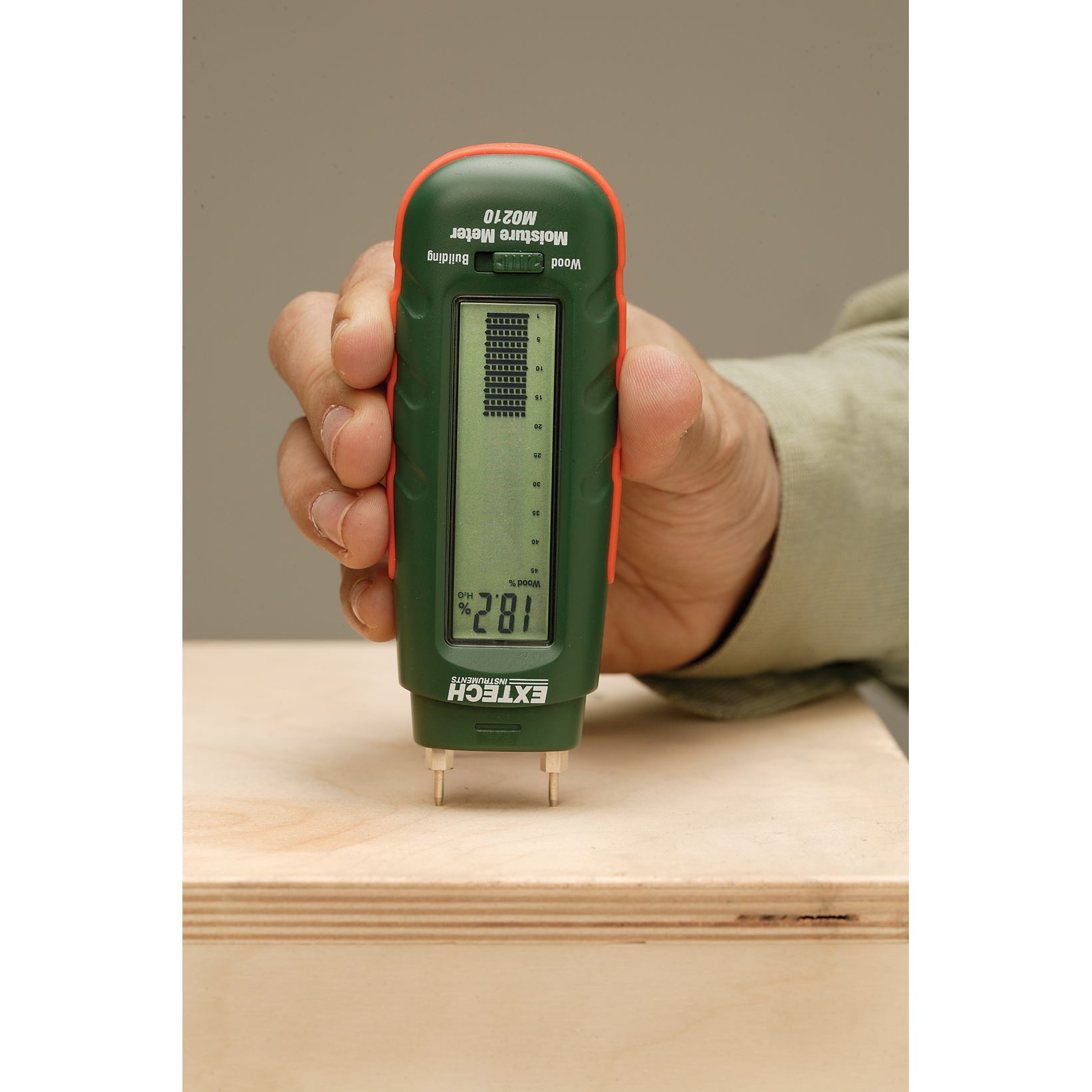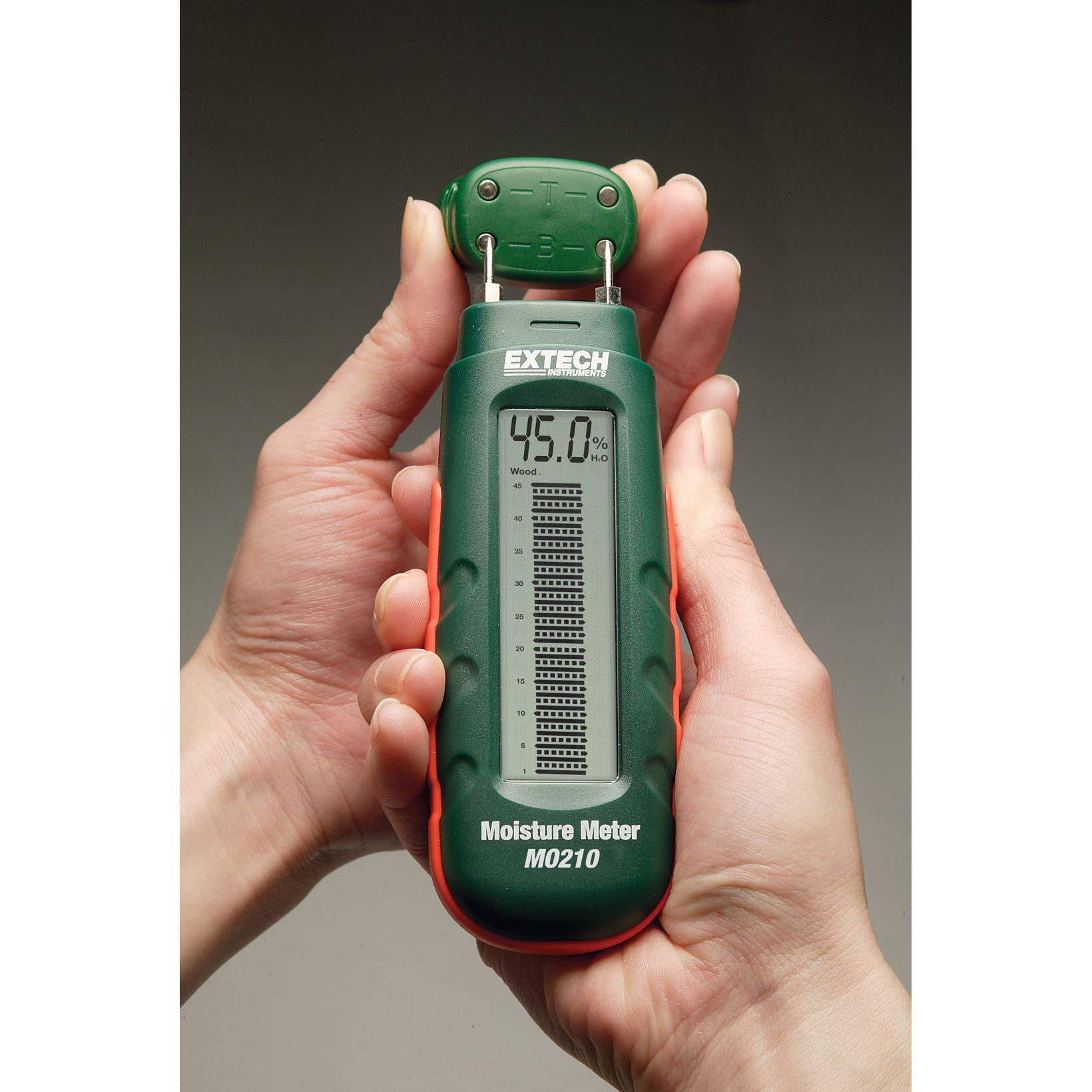De Extech MO210 zakformaat vochtmeter met 2-in-1 digitale LCD-weergave en analoge bargrafiek stelt u in staat snel te beoordelen of hout en andere poreuze materialen waterinfiltratie hebben doorstaan. Door de scherppuntige elektrodepinnen in het oppervlak van gipsplaat, beton, karton, mortel, pleisterwerk of andere bouwmaterialen te duwen en het apparaat detecteert vochtniveaus tussen 0,2% en 2,4%. Schuif de materiaalkeuze naar hout en de handmeter bepaalt de vochtaanwezigheid in hout van 6% naar 44%. Verdere functies zijn automatische uitschakeling en ingebouwde batterij controle.