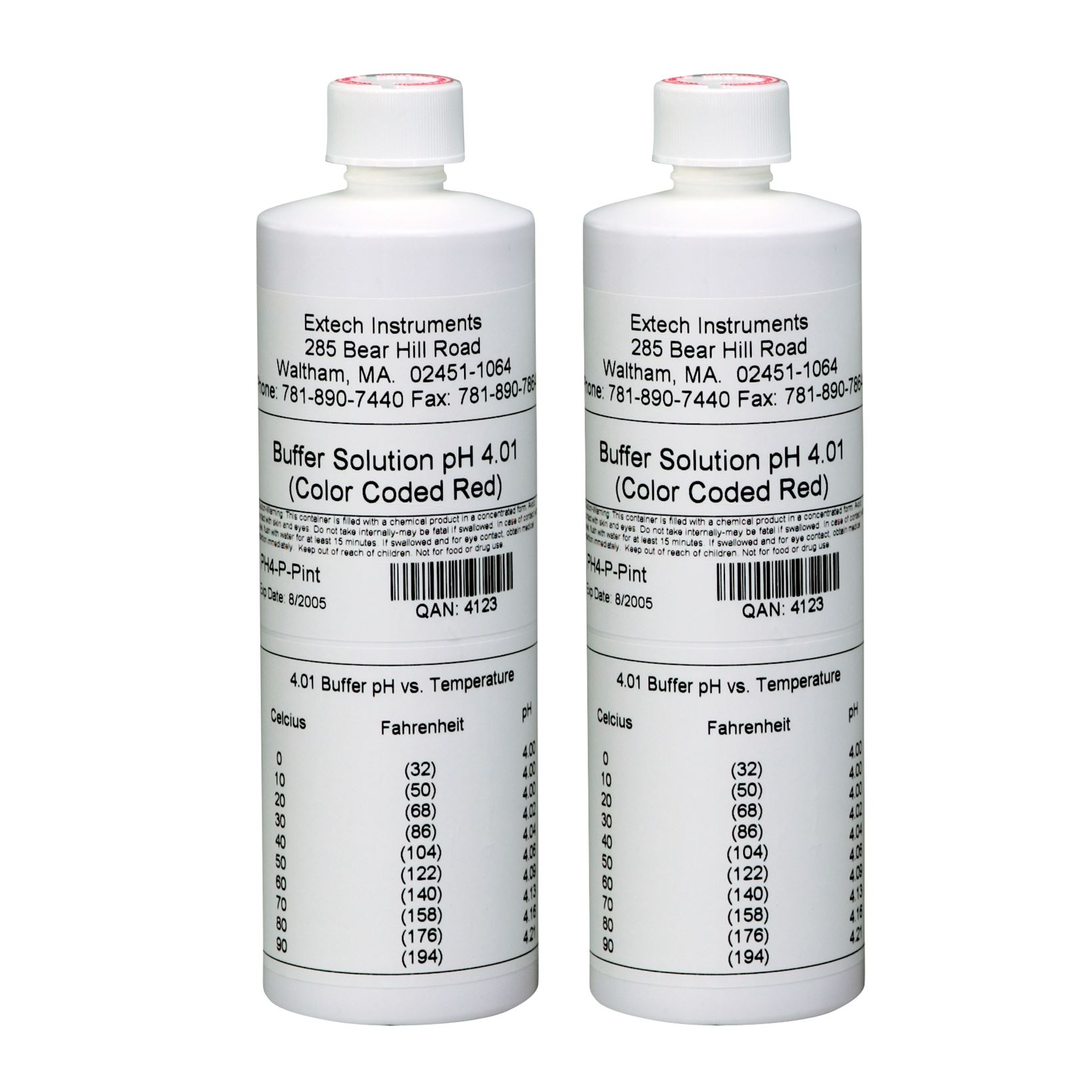 Extech PH4-P is een pH bufferoplossing met een pH-waarde van 4, geleverd in verpakkingen van twee flessen in pintformaat. Deze oplossing wordt gebruikt voor het kalibreren van pH meters, testers en elektrodes.