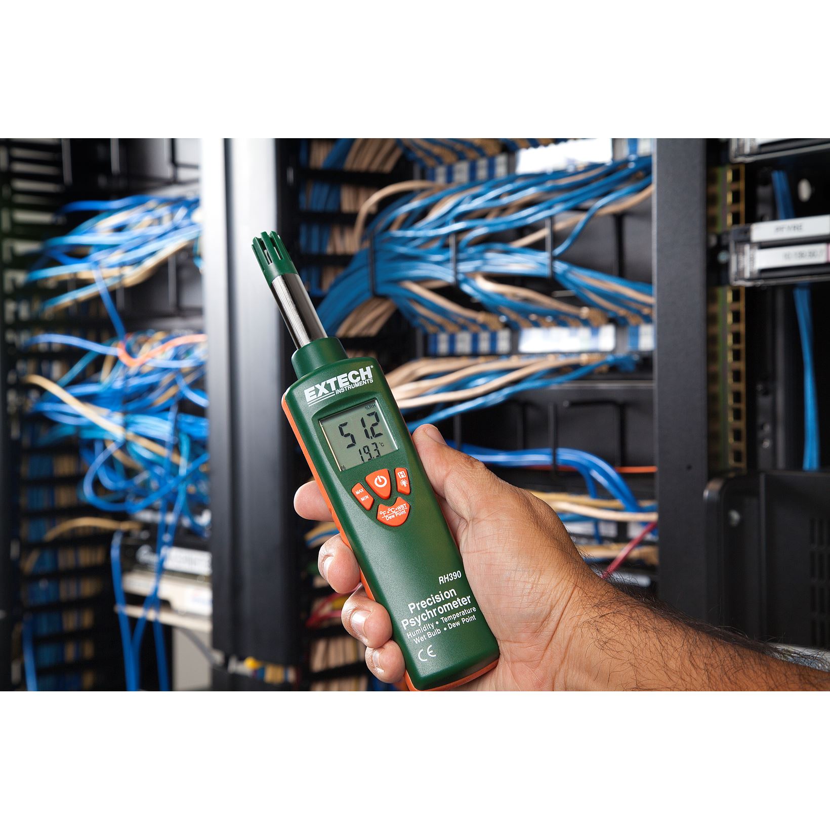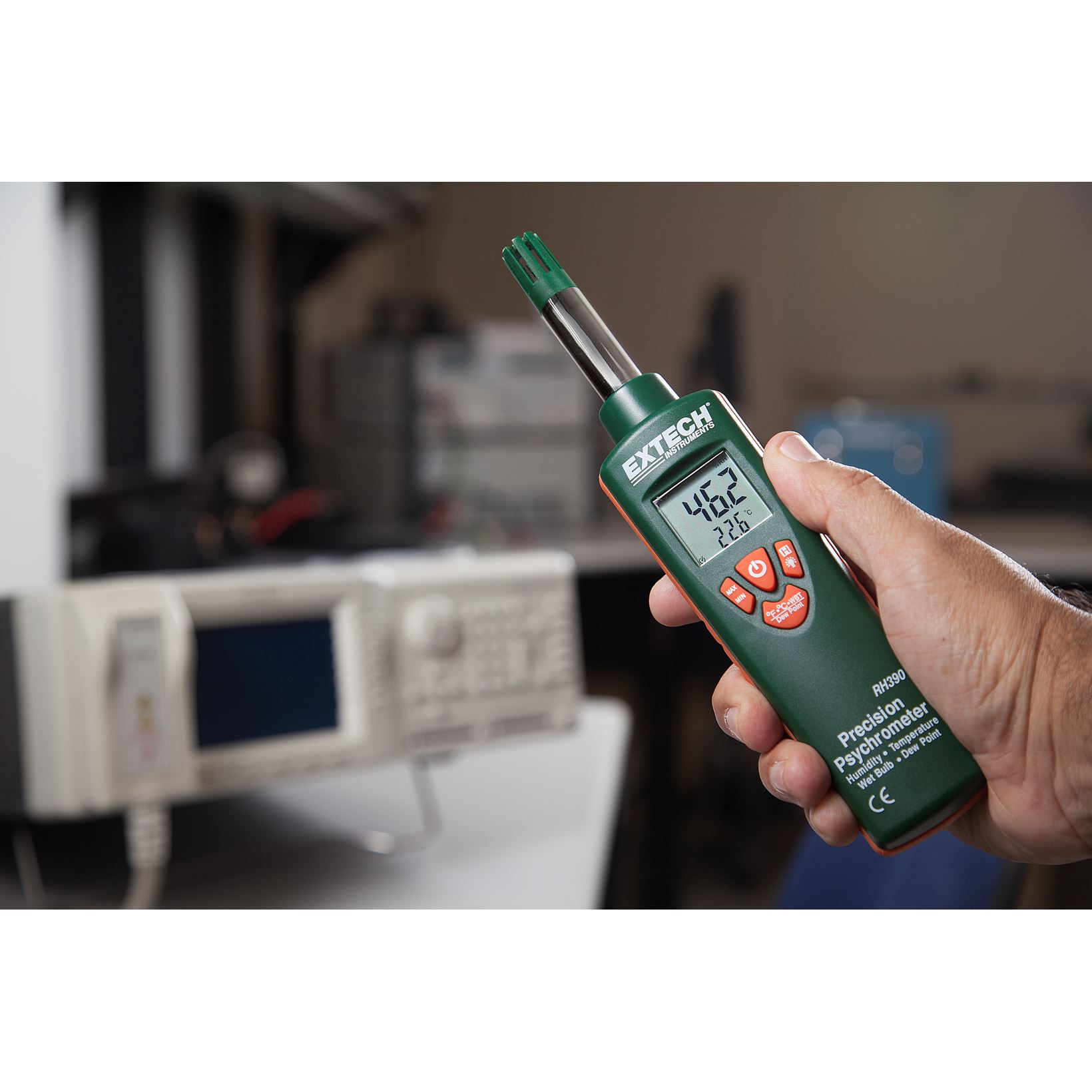 Extech RH390 Precisie psychrometer meet gelijktijdig vochtigheid en temperatuur. Een dubbel achtergrondverlicht lcd-display kan worden afgewisseld om natte bol/luchtvochtigheid, dauwpunt/luchtvochtigheid, of temperatuur/luchtvochtigheid weer te geven. De Extech RH390 meter registreert temperaturen van -22 graden tot 199°F (-30 tot 100°C). Deze precisie psychrometer heeft de hoogste 2% RH nauwkeurigheid met minder dan 30 seconden RH responstijd. Verdere kenmerken zijn o.a. Data Hold, Min/Max-functies, automatische uitschakeling en batterijmelding.